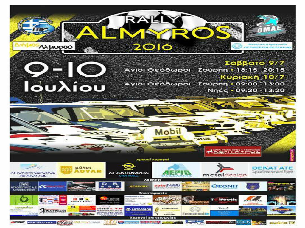 Το Σαββατοκύριακο 9 και 10 Ιουλίου θα διεξαχθεί το 1ο rally Αλμυρού. Το Θεσσαλικό Rally διοργανώνεται από τον Όμιλο Μηχανοκίνητου Αθλητισμού Θεσσαλίας (Ο.Μ.Α.Θ.), και συνολικά 28 πληρώματα θα διεκδικήσουν τη νίκη προσφέροντας πλούσιο θέαμα στους θεατές που θα παραβρεθούν.