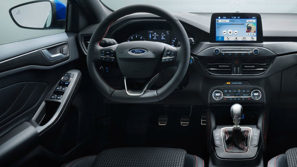 Στο εσωτερικό το νέο Focus έχει πολλά ίδια στοιχεία με το Fiesta. Το ταμπλό φαίνεται πιο μαζεμένο, ενώ την παράσταση κλέβει η οθόνη αφής μεγέθους 8”. Τα μαλακά υλικά δίνουν μια πιο ποιοτική αίσθηση, ενώ στις εκδόσεις Vignale και ST – Line επικρατούν στοιχεία όπως το ξύλο και δέρμα στη μία και τα περισσότερο αγωνιστικά στοιχεία, με τις κόκκινες ραφές στη δεύτερη.