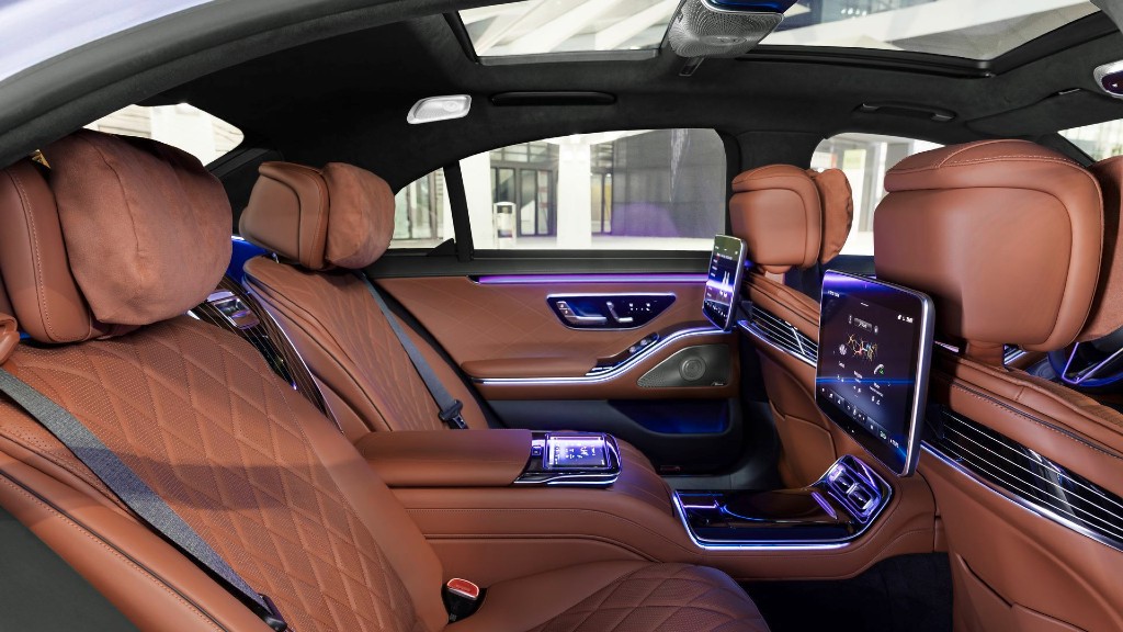 Για τους πίσω επιβάτες υπάρχουν οι οθόνες μεγέθους 11,6” στα προσκέφαλα τον εμπρός καθισμάτων, ενώ υπάρχει και το ηχοσύστημα με τα 30 ηχεία που ανεβάζει την εμπειρία του ήχου στο έπακρο. Στο νέο μοντέλο υπάρχουν 27 λιγότερα κουμπιά, αφού οι περισσότερες λειτουργίες γίνονται με την αφή. Τέλος, υπάρχει και το σύστημα φωνητικής υποβοήθησης “Hey Mercedes” και ο κρυφός φωτισμός που αποτελείται από 250 LED.