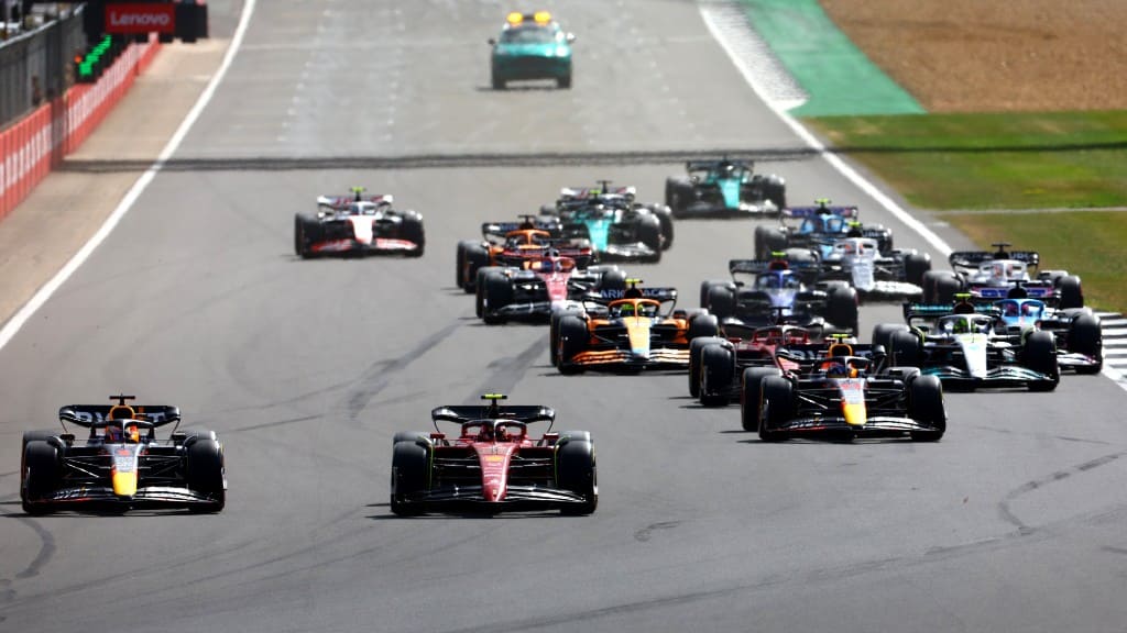 Σβήνοντας τα 5 κόκκινα φώτα ο Verstappen πετάχτηκε καλύτερα από τον Sainz περνώντας πρώτος, όμως στις πίσω θέσεις υπήρξε ατύχημα με τους Zhou, Russell, Albon, Tsunonda και Ocon. Αμέσως είχαμε κίτρινη σημαία και λίγα δευτερόλεπτα μετά κόκκινη σημαία και διακοπή του αγώνα. Το μονοθέσιο του Zhou αναποδογύρισε μετά την επαφή με τον Russell, που είχε ακουμπήσει πριν με τον Gasly. Ευτυχώς ο Κινέζος οδηγός της Alfa Romeo βγήκε από το μονοθέσιο χωρίς σοβαρά προβλήματα, μεταφερόμενος με φορείο στο ιατρείο της πίστας.