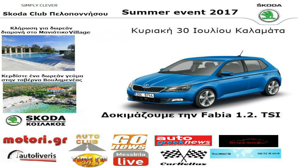 Το Skoda Club Πελοποννήσου για άλλη μια φορά αποφάσισε να συναρπάσει τους πάντες. Αυτή τη φορά δε θα υπάρχει μόνο ένα καλοκαιρινό event δοκιμής, αλλά και μεγάλα καλοκαιρινά δώρα. Η δοκιμή θα γίνει με το Fabia 1.2 TSI και το ραντεβού δίνεται στην οδό Ναυαρίνου στο Εσπερία στην πόλη της Καλαμάτας την Κυριακή 30 Ιουλίου και ώρα 10:30 το πρωί.