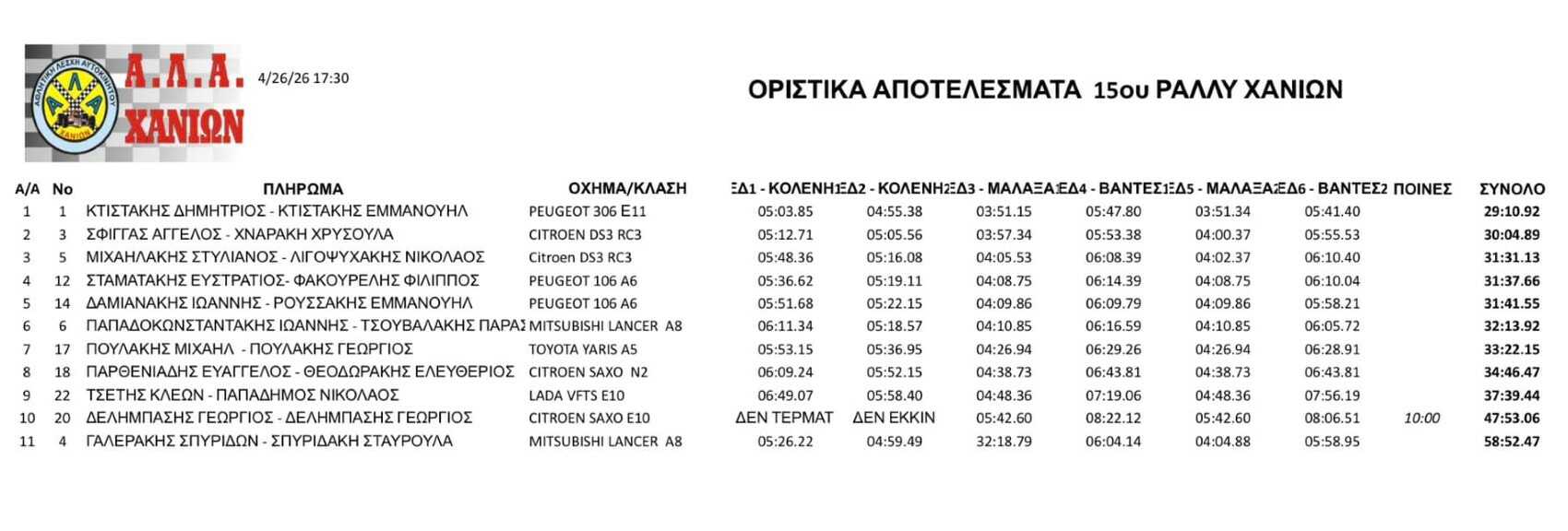 Τα αποτελέσματα του 15ου Rally Χανίων 2026