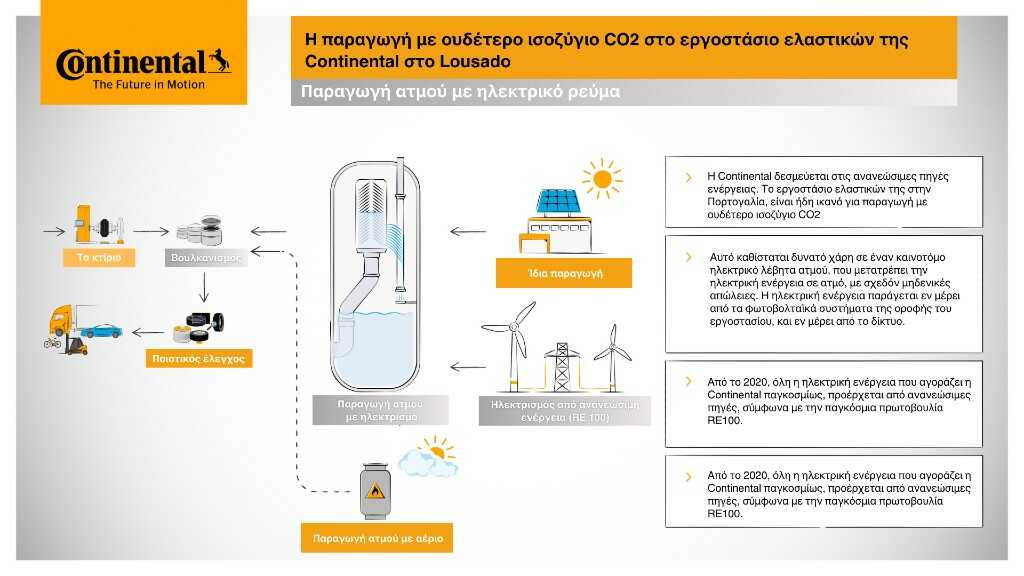 Από το 2024, η Continental μπορεί να παράγει ελαστικά με απολύτως ουδέτερο CO2, στο εργοστάσιο ελαστικών της στο Lousado της Πορτογαλίας. Έτσι, η εταιρεία κάνει ένα σημαντικό βήμα προς τον στόχο της, για εντελώς ουδέτερη παραγωγή σε CO2. Αυτό είναι δυνατό, χάρη στην παραγωγή ατμού με χρήση λέβητα, που λειτουργεί εξ’ ολοκλήρου με ηλεκτρική ενέργεια. Η Continental χρησιμοποιεί τόσο ηλιακή ενέργεια που παράγεται από την ίδια, όσο και ηλεκτρική ενέργεια από ανανεώσιμες πηγές από το ηλεκτρικό δίκτυο, για την παραγωγή του ατμού της. Παλαιότερα, το φυσικό αέριο ήταν η μοναδική πηγή ενέργειας για την παραγωγή ατμού στο εργοστάσιο ελαστικών στο Lousado, το οποίο είναι ένα από τα μεγαλύτερα, με ετήσια ικανότητα παραγωγής 18.000.000 ελαστικών.