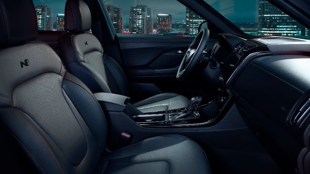 Στο εσωτερικό ξεχωρίζουν τα μαύρα καθίσματα με τις κόκκινες ραφές και το λογότυπο N, το δερμάτινο τριάκτινο τιμόνι με τα χειριστήρια και ο δερμάτινος επιλογέας ταχυτήτων. Το μαύρο χρώμα συνεχίζεται και στο ταμπλό, ενώ υπάρχει και η οθόνη αφής, με το σύστημα ενημέρωσης και ψυχαγωγίας. Στον εξοπλισμό συναντάμε 6 αερόσακους, αυτόματο κλιματισμό, αεριζόμενο κάθισμα οδηγού και φυσικά όλα τα νέα συστήματα ασφαλείας.