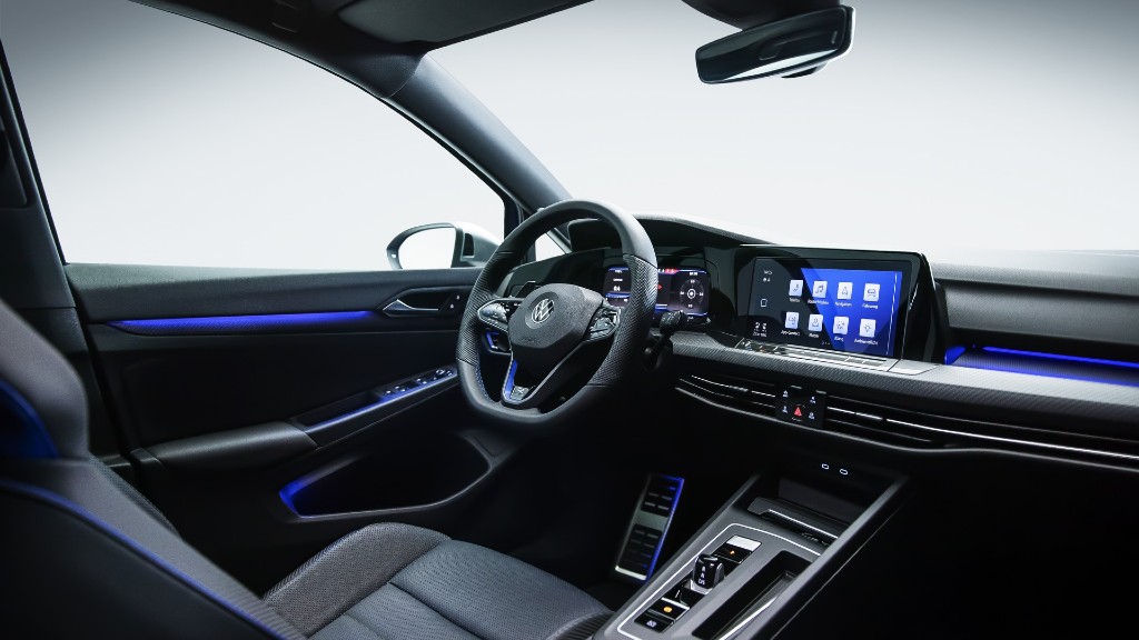 Στο εσωτερικό δεσπόζουν τα bucket δερμάτινα καθίσματα από Nappa, με τις μπλε ραφές. Επιπλέον, υπάρχει ο ψηφιακός πίνακας οργάνων και η οθόνη αφής μεγέθους 10”, με το σύστημα ενημέρωσης και ψυχαγωγίας. Το δερμάτινο σπορ τριάκτινο τιμόνι με τα χειριστήρια, ο δερμάτινος επιλογέας ταχυτήτων και τα πεντάλ αλουμινίου δίνουν μια άλλη αίσθηση στο εσωτερικό. Για όσους θέλουν να παίξουν λίγο παραπάνω στο τιμόνι υπάρχει το κουμπί R, το οποίο ενεργοποιεί το Race Mode.