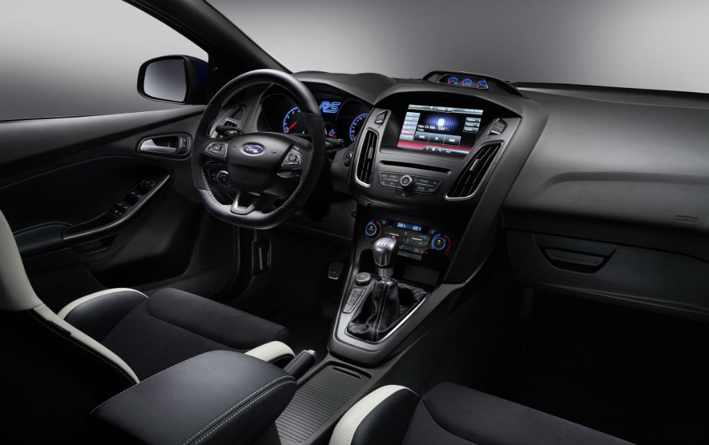 Στο εσωτερικό συναντάμε τα Sport δερμάτινα καθίσματα της Recaro, τα οποία έχουν στο κέντρο ραμμένο το λογότυπο RS, καθώς και το νέο πίνακα οργάνων της Ford. Επιπλέον ξεχωρίζει η έγχρωμη οθόνη αφής, μεγέθους 8”, όπου μπορεί να εντοπίσει κανείς όλα τα συστήματα του αυτοκινήτου, καθώς και τις συνδέσεις με Smartphones ή USB, τον πλοηγό και τη ρύθμιση του κλιματισμού. Στην ίδια οθόνη, ο οδηγός μπορεί να ρυθμίσει το ηχοσύστημα της Sony με τα 10 ηχεία και το Subwoofer, αλλά ταυτόχρονα και να παρκάρει άνετα με την κάμερα οπισθοπορείας.
