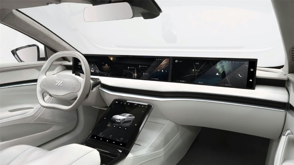 Στο εσωτερικό ξεχωρίζει η τεράστια 4K ψηφιακή οθόνη μεγέθους 39”, η οποία χωρίζεται σε τρία κομμάτια. Επιπλέον, στη θέση του κιβωτίου ταχυτήτων βρίσκεται μια ακόμη ψηφιακή οθόνη μεγέθους 12,8”. Το τιμόνι κόβει το κυκλικό κομμάτι από την κάτω πλευρά και γίνεται επίπεδο, ενώ τα χειριστήρια είναι αφής. Φυσικά, η πολυτέλεια περισσεύει με τα δερμάτινα καθίσματα και το δερμάτινο ή ξύλινο ταμπλό.