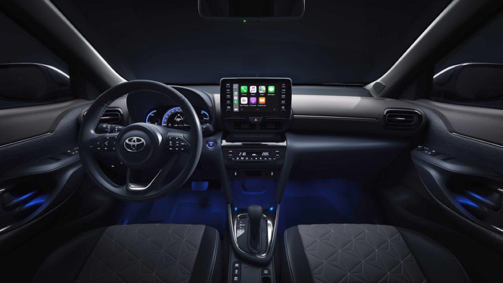 Στο εσωτερικό ξεχωρίζουν οι δύο οθόνες μια για τον πίνακα οργάνων, με το στροφόμετρο και το ταχύμετρο να απεικονίζονται σε αναλογική μορφή και μια για σύστημα ενημέρωσης και ψυχαγωγίας. Το δερμάτινο τριάκτινο τιμόνι με τα χειριστήρια, ο δερμάτινος επιλογέας ταχυτήτων, αλλά και τα δερμάτινα καθίσματα θέλουν να κάνουν πιο άνετη τη ζωή του οδηγού και των επιβατών. Ο εσωτερικός διακριτικός φωτισμός κάνει το Yaris Cross ακόμη πιο ελκυστικό.