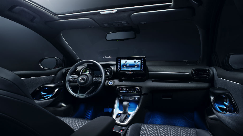 Μπαίνοντας στο εσωτερικό το νέο Yaris είναι διαφορετικό. Ο πίνακας οργάνων είναι ψηφιακός με την ένδειξη ταχυτήτων και το ταχύμετρο να κερδίζουν τη μερίδα του λέοντος. Το κουμπί εκκίνησης και το θερμαινόμενο τριάκτινο τιμόνι με τα χειριστήρια κάνει πιο εύκολη τη ζωή του οδηγού, αλλά αυτό που κερδίζει είναι η TFT οθόνη αφής μεγέθους 10”, με το σύστημα ενημέρωσης και ψυχαγωγίας. Ο εσωτερικός φωτισμός στο υβριδικό μοντέλο είναι σε μπλε χρώμα που δημιουργεί μια υπέροχη ατμόσφαιρα κυρίως στο σκοτάδι.
