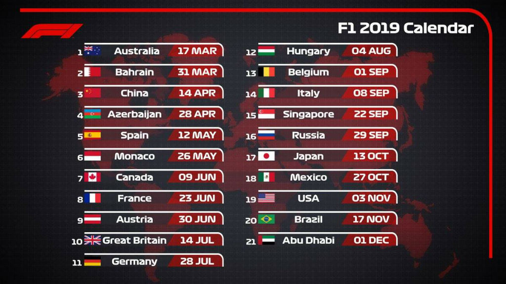 Όπως πάντα οι αγώνες θα ξεκινήσουν από την Αυστραλία στις 17 Μαρτίου 2019 και θα ολοκληρωθούν την 1η Δεκεμβρίου στο Abu Dhabi. Όπως και το 2018 έτσι και το 2019 θα έχει 21 αγώνες χωρίς να έχουμε κάποια καινούργια είσοδο. Ο πιο γεμάτος μήνας θα είναι ο Σεπτέμβριος όπου υπάρχουν τέσσερα GP, ενώ τον Ιούνιο θα διεξαχθούν τρία.