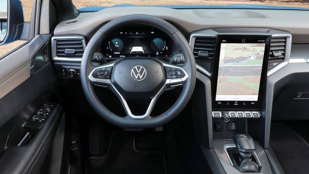 Μπαίνοντας στο εσωτερικό βλέπουμε πως το Amarok δεν έχει να ζηλέψει τίποτα από τα συμβατικά μοντέλα που κυκλοφορούν. Τα δερμάτινα καθίσματα με τις κόκκινες ραφές προσφέρουν άνεση, ενώ το δερμάτινο τριάκτινο τιμόνι με τα χειριστήρια και ο δερμάτινος επιλογέας ταχυτήτων ανεβάζουν τον πήχη της πολυτέλειας. Οι δύο ψηφιακές οθόνες, μια για τον πίνακα οργάνων μεγέθους 12,3” και μια αφής μεγέθους 10” ή 12”, με το σύστημα ενημέρωσης και ψυχαγωγίας κάνουν πιο εύκολη τη ζωή του οδηγού.