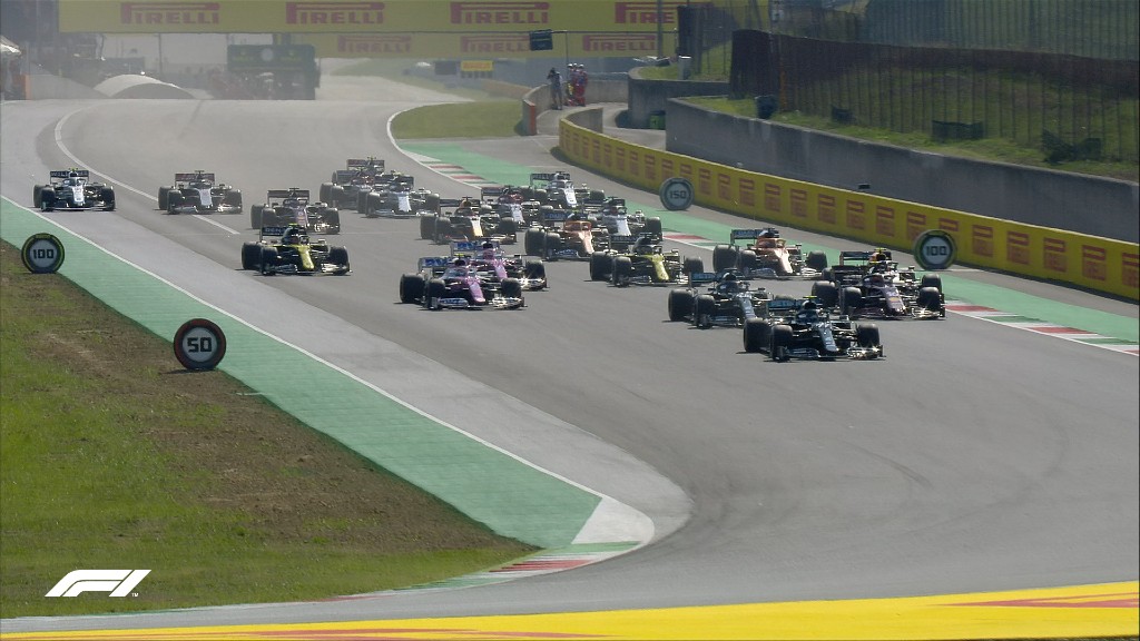 Σβήνοντας τα 5 κόκκινα φώτα ο Hamilton δεν ξεκίνησε καλά, με αποτέλεσμα ο Bottas να περάσει στην κορυφή, ενώ ο Verstappen προσπάθησε να περάσει και αυτός τον Hamilton όμως έχασε τη δύναμη του μονοθεσίου μένοντας πίσω. Ο Leclerc εκμεταλλεύτηκε τα πάντα και βρέθηκε στην τρίτη θέση πίσω από τις δύο Mercedes. Στη πρώτη στροφή ο Sainz έκανε τετακέ, με τον Vettel να μη μπορεί να το αποφύγει και να χάνει την πτέρυγα. Την ίδια ώρα από αυτό το συμβάν έμειναν εκτός οι Gasly και Verstappen.